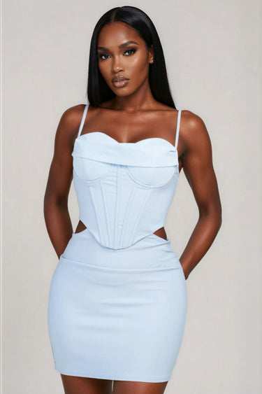 Feminine, structured, and made to be remembered — the Always Be Mine Cowl Neck Corset Mini Dress features thin spaghetti straps, a draped cowl neckline with folded bust detail, and a structured corset bodice with boning seam detailing that sculpts the waist to perfection. Side cutouts at the waist and a fitted bodycon mini skirt below create a bold, sensual silhouette. Available in lemon yellow and baby blue — style it with heels for nights out, parties, and every occasion worth dressing up for.
