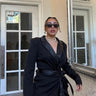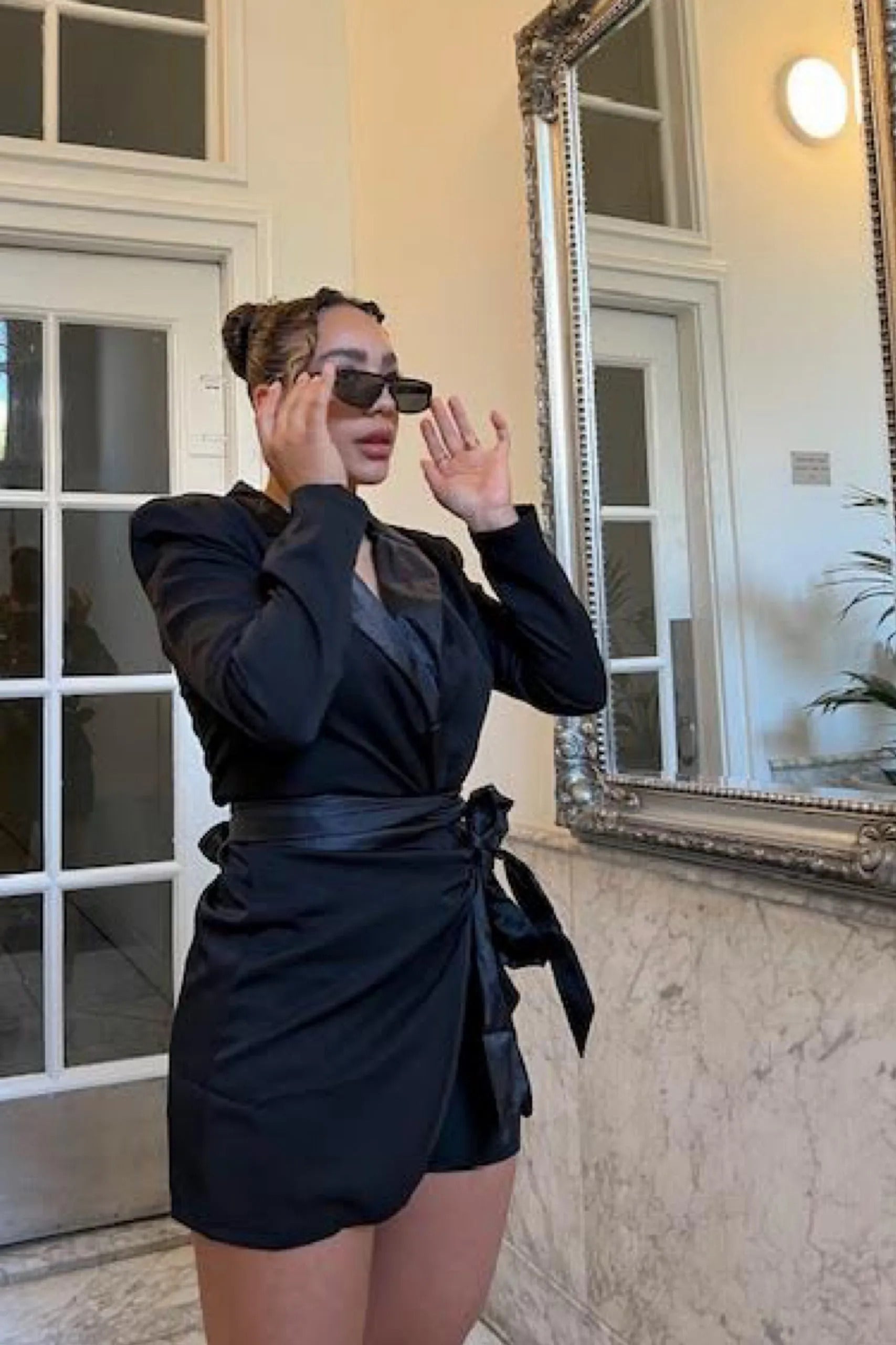 The Risk Taker Blazer is power dressing, redefined — a structured mini blazer dress with padded shoulders, a satin-trimmed lapel, and a wide self-tie belt that cinches the waist into a sharp, commanding silhouette. The deep V wrap front and asymmetric hem keep it firmly in after-dark territory. One piece, zero effort, full impact.