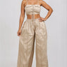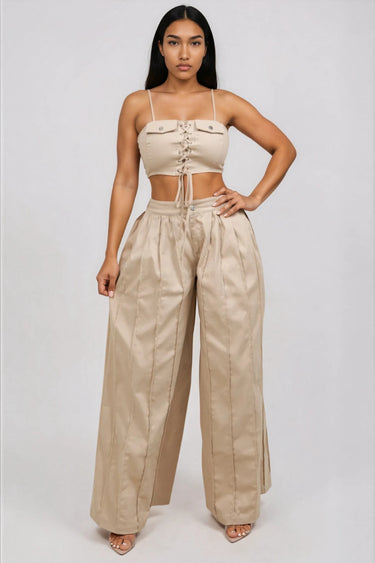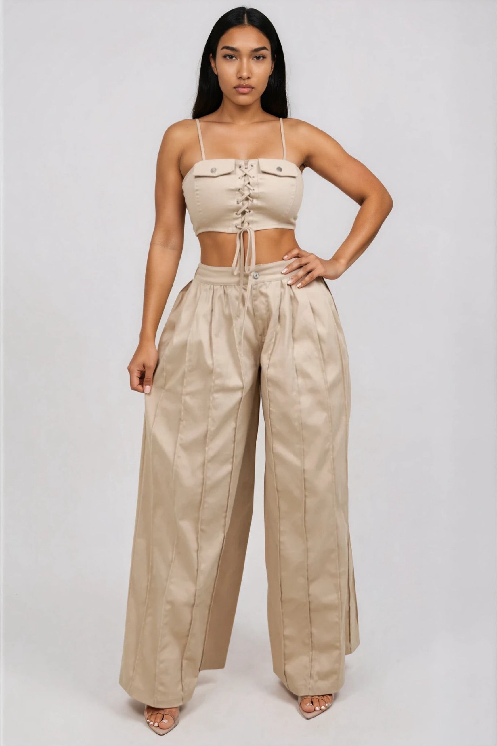 Structured, sleek, and effortlessly commanding — the Endless Love Top and Pants Two-Piece Set features a cropped spaghetti strap top with a lace-up front closure, decorative snap pockets, and a matching lace-up waistband on the high-waisted wide-leg trousers. Deep front pleats, vertical pintuck seams, and subtle side slits at the hem give the pants a polished, editorial silhouette. Crafted in a taupe woven fabric, this co-ord set is made for the woman who dresses with intention.