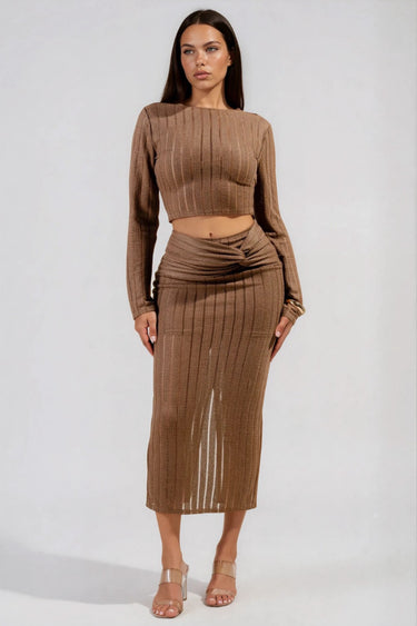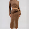 Rich, warm, and effortlessly luxe — the Let's Talk Stripe Terry Knit Two-Piece Set features a long-sleeve boat neck crop top in semi-sheer ribbed knit with vertical metallic gold lurex stripes and a zip closure at the center back, paired with a high-waisted midi skirt with a twist/knot detail at the front, ruched hip detail, and a back slit at the hem. The body-contouring silhouette and expresso mocha tone make this co-ord set the ultimate choice for date nights, dinners, and every occasion that deserves a polished, editorial look.