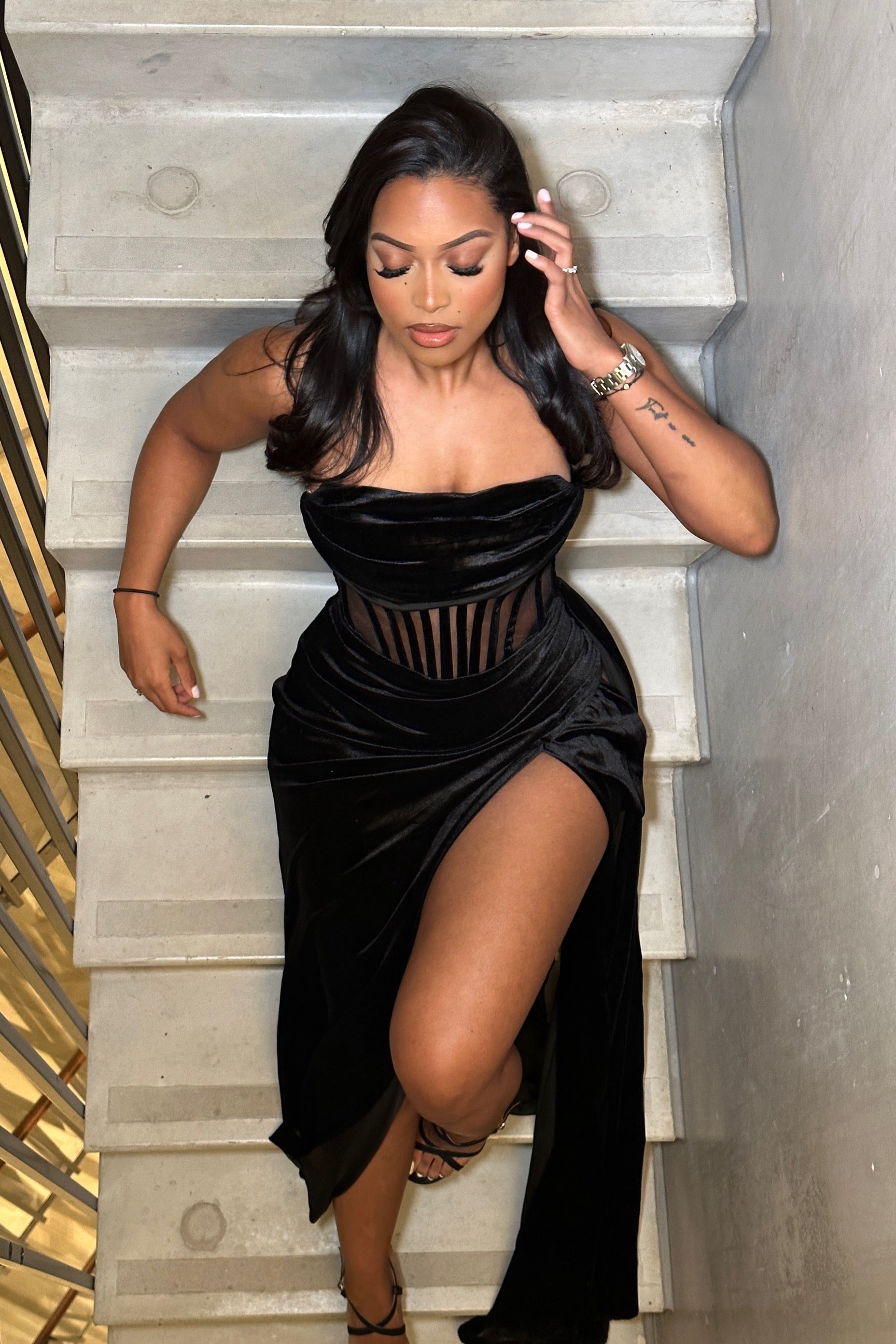 Make a statement in the Conquer My Love Maxi Dress, available in black. This elegant dress offers structured support and a flattering, fitted silhouette. Luxurious velvet accents and a bold slit add a touch of allure and modern sophistication. Made from stretch material for comfort and a perfect fit. Perfect for making a lasting impression at any special occasion.