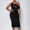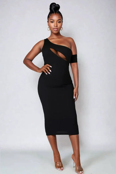 The Feeling Myself Midi Dress is a black bodycon midi that earns every look — an asymmetric diagonal one-shoulder strap, two cut-out windows at the bust, and a short off-shoulder sleeve band on the opposite side create a silhouette that’s architectural and unapologetically bold. Second-skin stretch from neckline to midi hem. In Black.