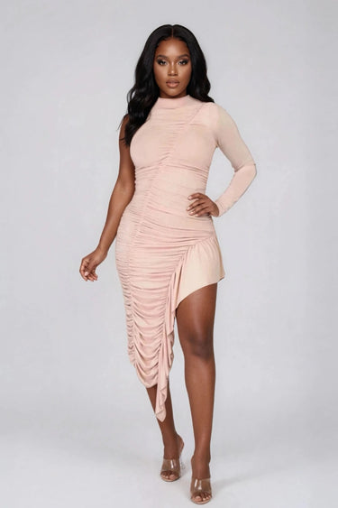 The Next to You Midi Dress is a study in asymmetry — a second-skin ruched stretch dress with a one-shoulder construction, single long sleeve, and a front ruched drawstring panel that pulls the hem into a dramatic asymmetric silhouette, shorter on one side and longer on the other. All-over ruching sculpts the body from neckline to hem. In taupe, it’s understated and undeniable.