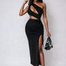 The No Control Cut-Out Midi Dress is a black bodycon midi that commands the room — a one-shoulder silhouette with a large diagonal cut-out sweeping from the chest across the midriff, a single strap bridging the negative space, and a ruched drawstring side panel that gathers the skirt and opens into a front slit. Architectural, intentional, and entirely in control. In Black.