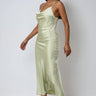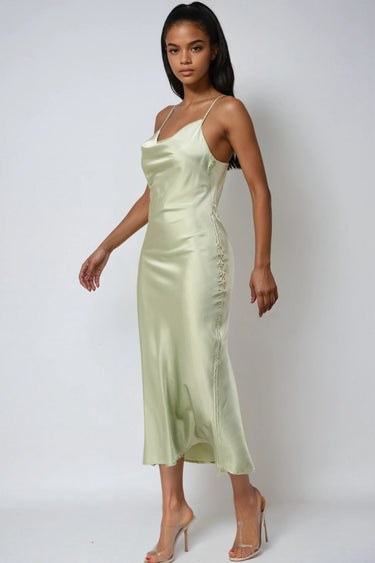 The You Know the Vibes Midi Dress is the slip dress that gets it right — high-shine satin, a draped cowl neckline, double spaghetti straps, and a ruched side seam detail that gives the fluid midi silhouette just enough edge. Body-skimming without trying. Available in Cream and Sage.