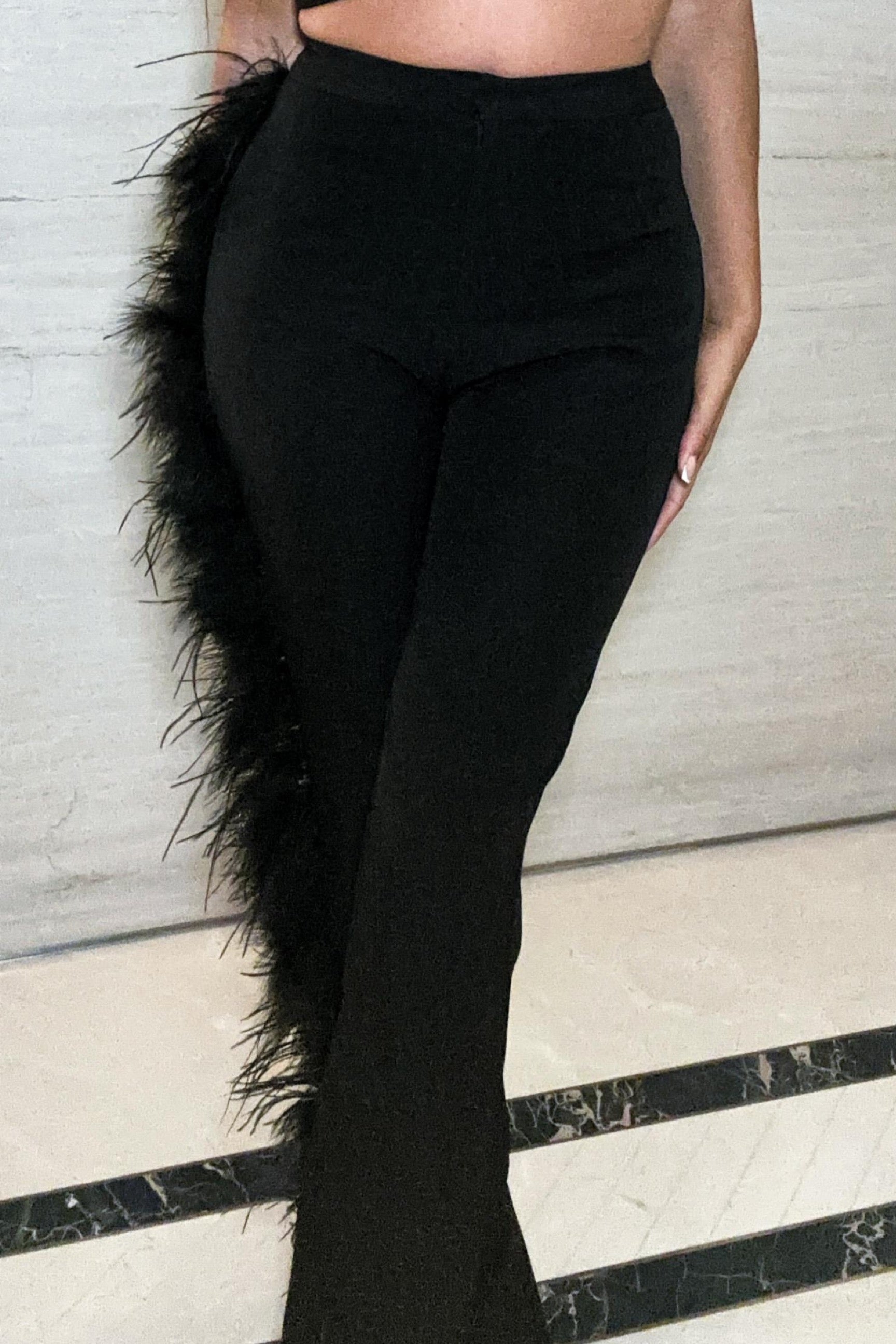 Elevate your evening look with the Date Night top and pants two-piece set. Made from sturdy woven fabric, this set features a chic crop top with a twist-front detail and rhinestone straps, paired with statement feathered pants. Perfect for special occasions, it offers a flattering fit that elongates your legs and ensures you make a lasting impression.