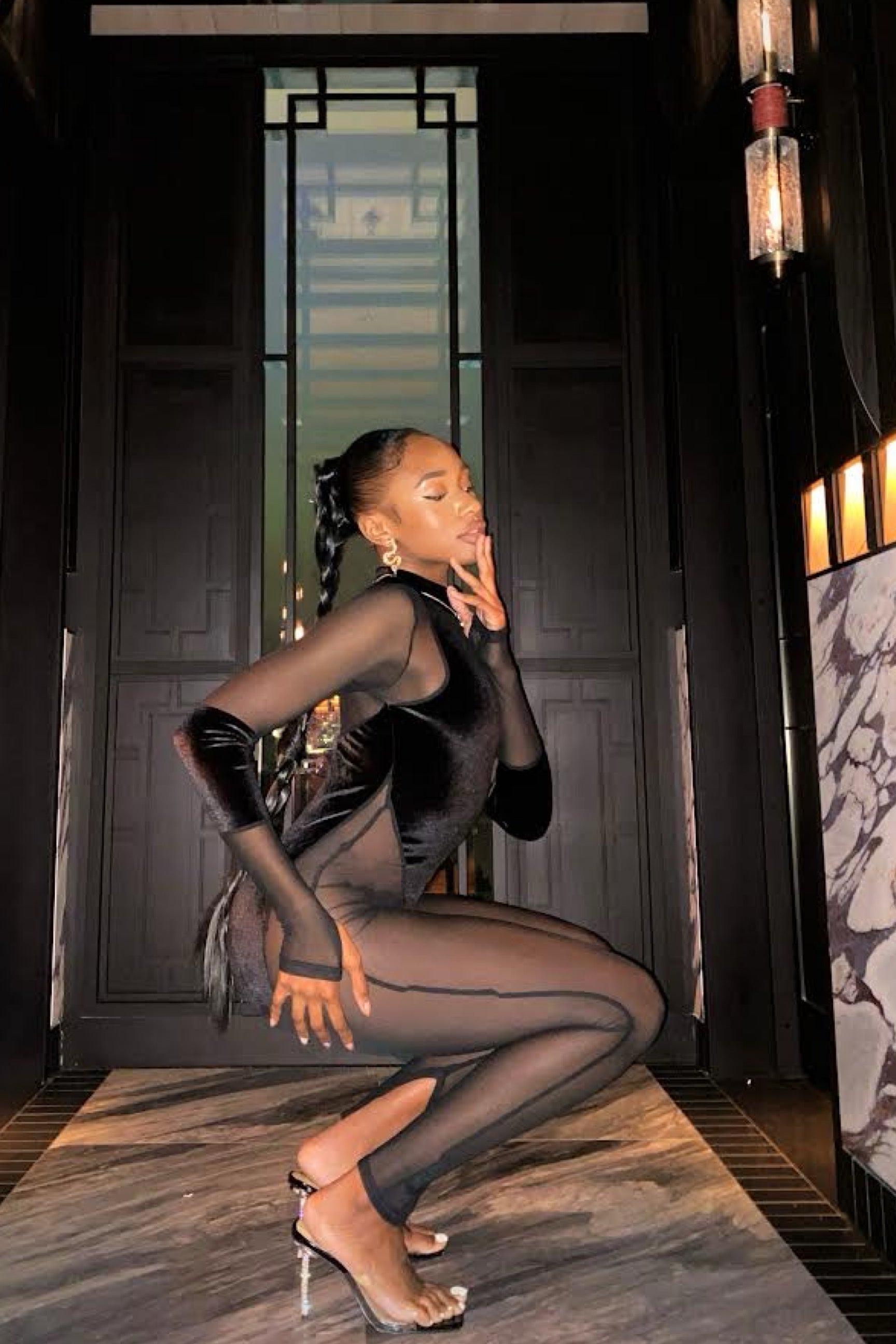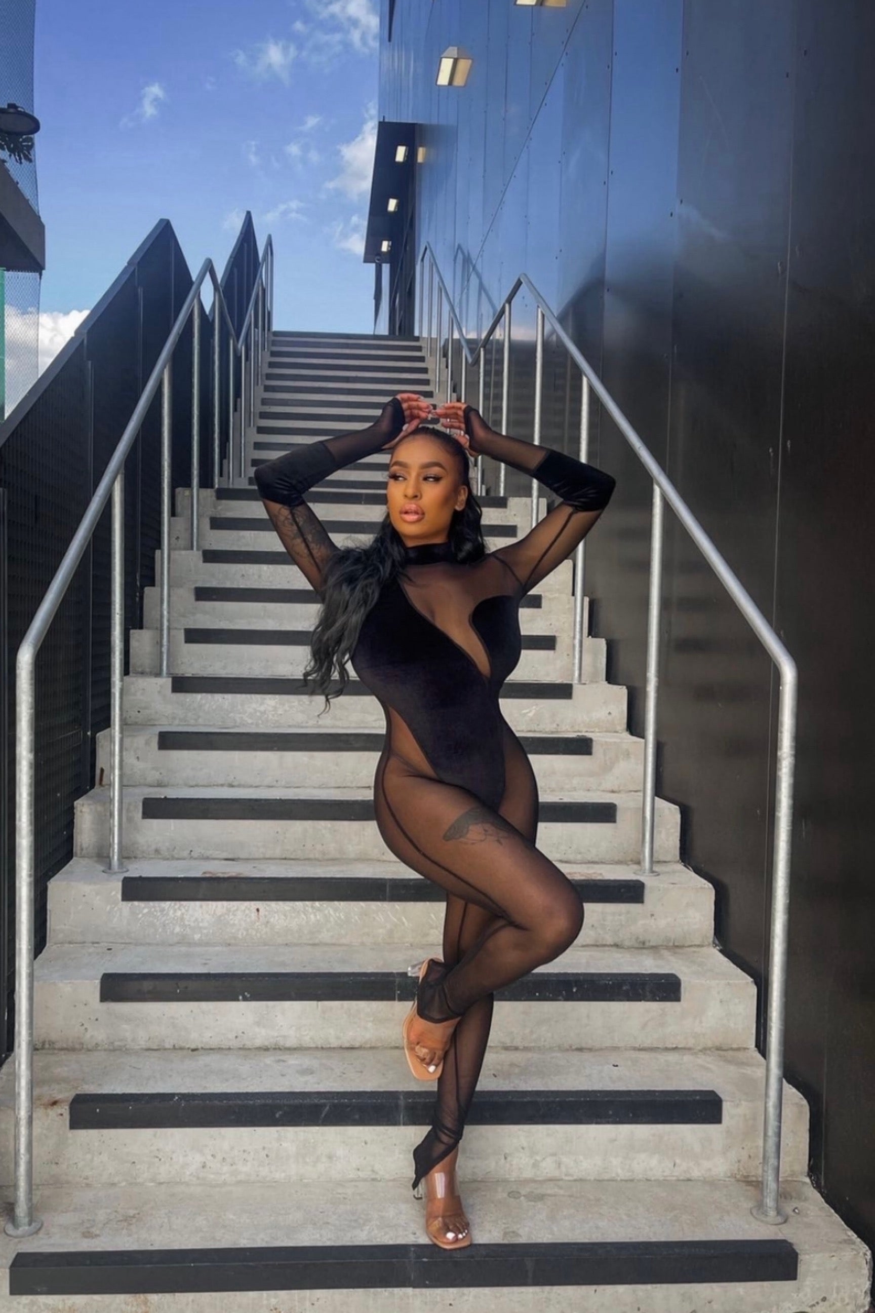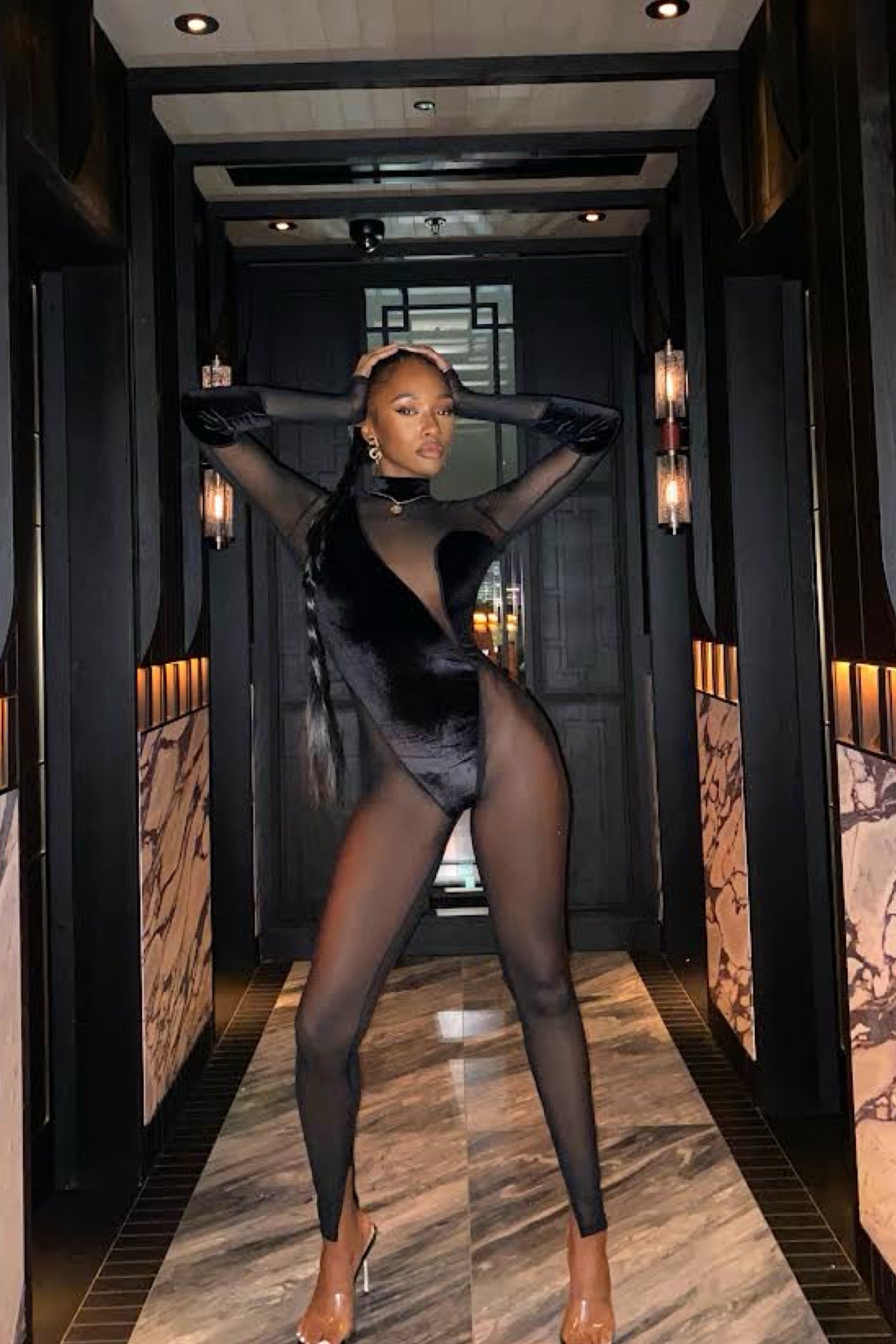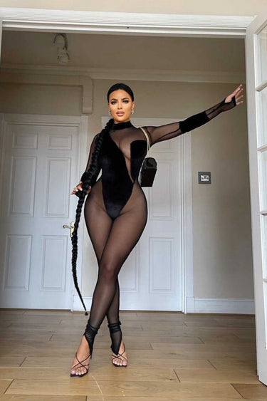 The Step Ya Game Up velvet jumpsuit is the definition of bold sophistication. Crafted in a mix of plush black velvet and sheer mesh, it strikes the perfect balance between daring and refined. The asymmetric sheer paneling creates a dramatic illusion, while the high neckline and long sleeves keep the look sleek and polished. The body-hugging fit sculpts every curve, making it a true statement piece. Styled with strappy heels and minimal accessories, this jumpsuit ensures all eyes are on you — whether for a night out or a high-fashion event.