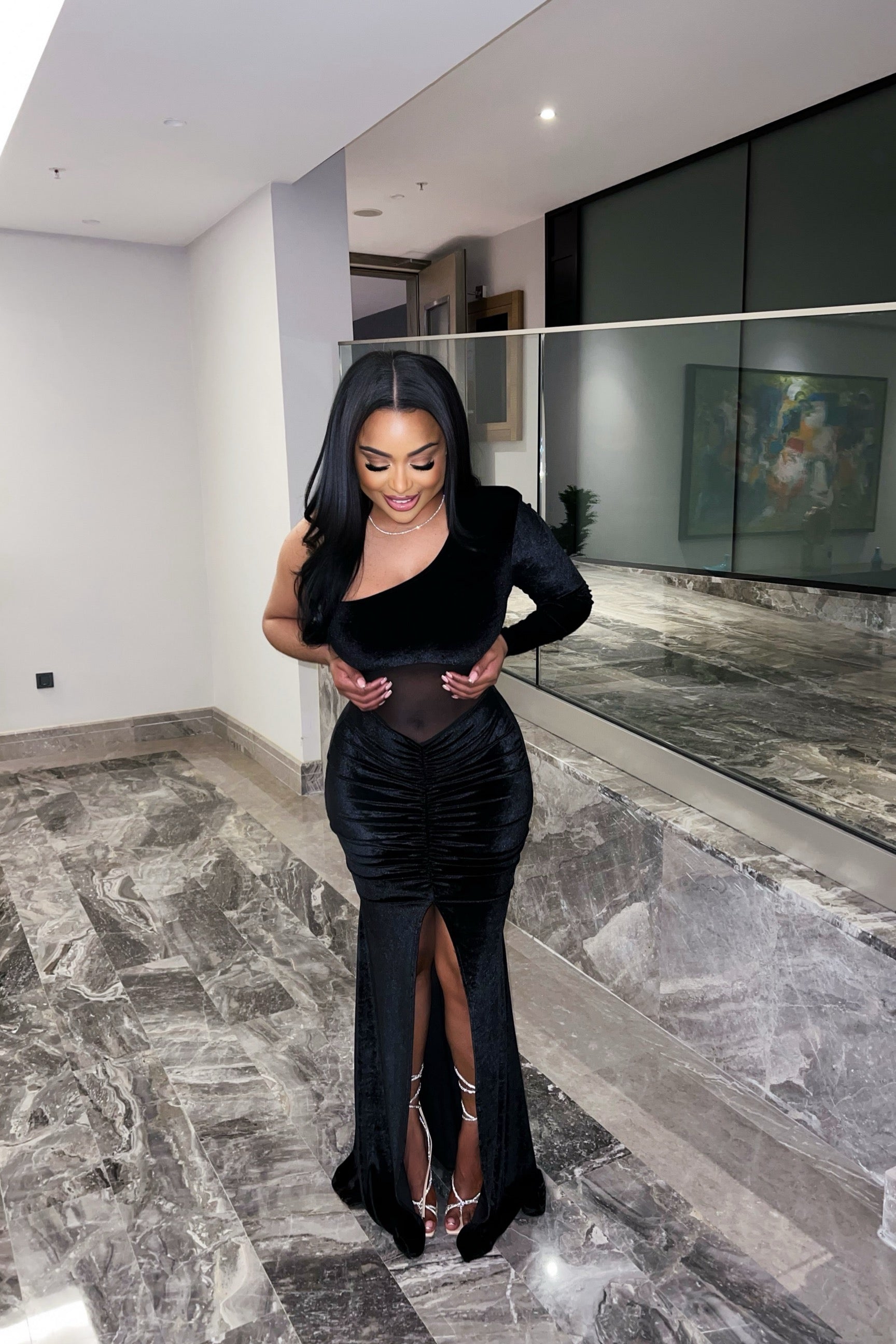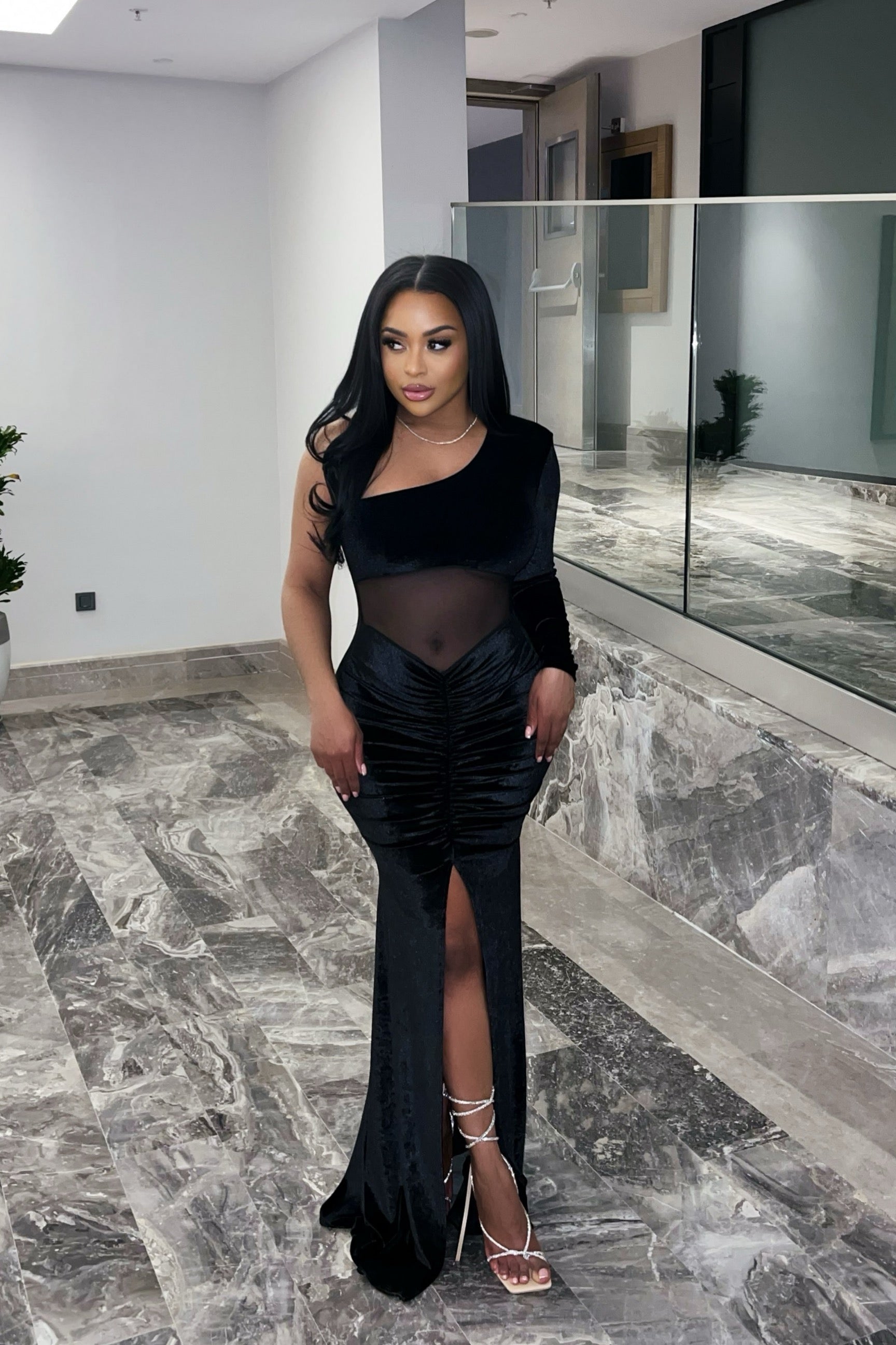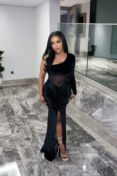 Elevate your evening look with The Very Best Velvet Maxi Dress. Designed in luxurious velvet with a figure-hugging fit, this gown blends elegance with bold modern details. The one-shoulder neckline and sheer mesh waist panel create a sultry silhouette, while the ruched detailing and thigh-high slit add drama and sophistication. Perfect for black-tie events, galas, or a night where you want to make the ultimate statement.
