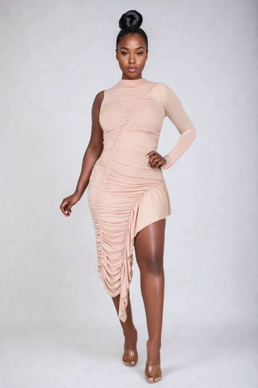 The Next to You Midi Dress is a bold and modern statement piece that blends elegance with a touch of edge. Designed in a soft light taupe tone, this figure-hugging dress features striking asymmetric details that make it stand out. The one-shoulder silhouette with a single long sleeve creates a unique balance of coverage and allure, while the ruched fabric sculpts the body beautifully. The asymmetrical hemline with cascading drapes adds movement and sophistication, making this dress perfect for evening events, parties, or special occasions.