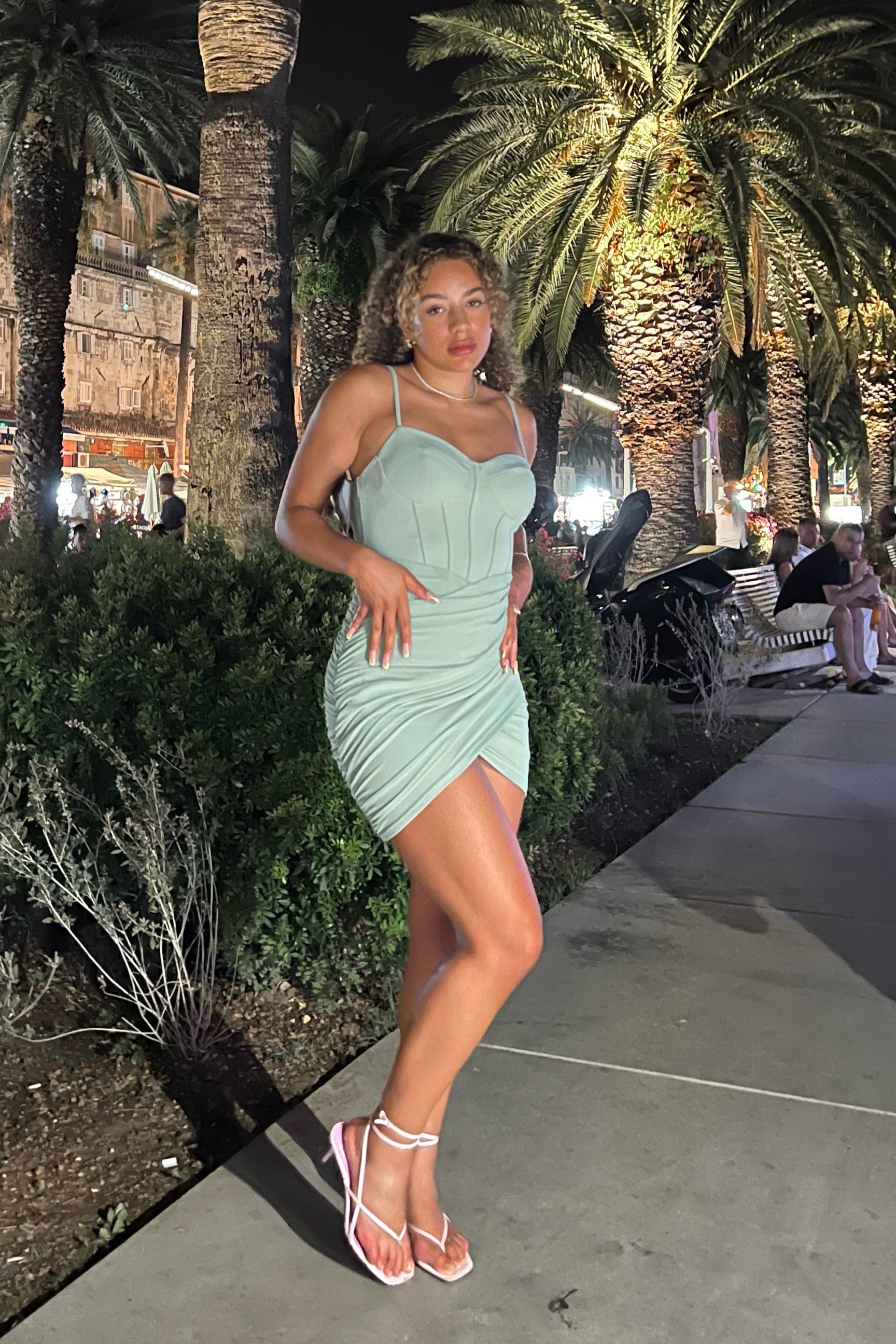 The Undeniably Cute wrap dress is a flirty, figure-loving piece designed to turn heads effortlessly. In a soft pastel green shade, it brings a refreshing pop of color perfect for both day and night looks. The structured corset-style bodice adds definition and support, while the ruched wrap skirt flatters the waist and hips with a playful touch. Finished in a mini length, this dress balances sweet elegance with confident allure — ideal for date nights, parties, or brunch with a fashionable twist.