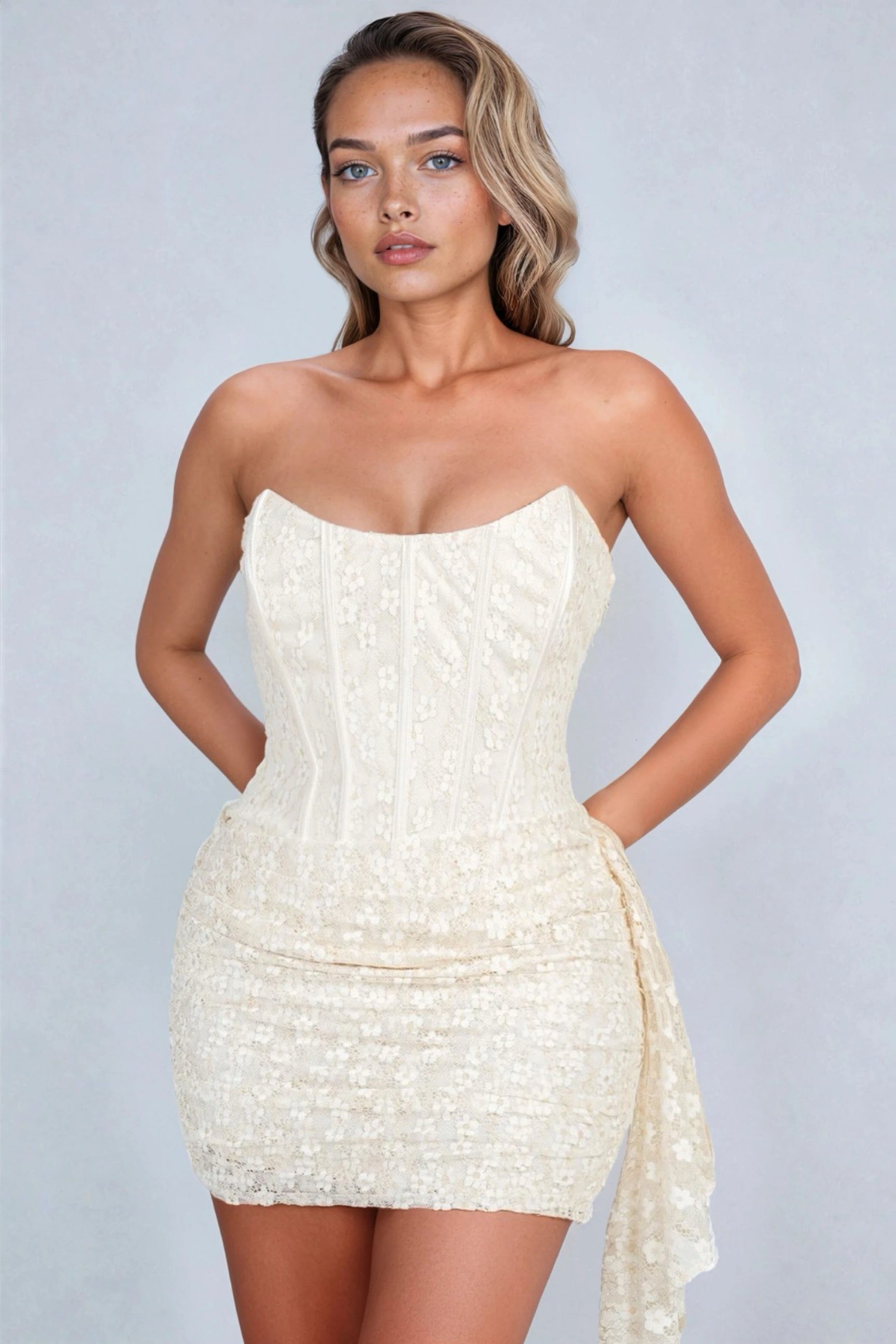 Turn heads in this stunning Attention strapless corset lace mini dress, crafted with a flattering corset-style bodice that sculpts the waistline. Designed in delicate floral lace with a soft cream hue, it combines elegance and allure. The fitted silhouette highlights your curves, while the draped side detail adds a romantic, feminine touch. Perfect for special occasions, parties, or an unforgettable night out.