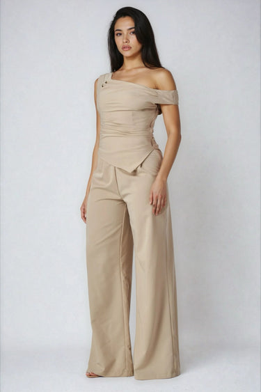 Step into effortless elegance with the Ready or Not Two-Piece Top and Pants Set, a stylish women’s co-ord set designed for a sleek and modern silhouette. This matching set features an asymmetrical off-shoulder top with subtle draping and a flattering angled hem that accentuates the waist. The high-waisted wide-leg pants flow beautifully, creating a long and polished look. Crafted for versatility, this two-piece outfit transitions seamlessly from day to night, making it perfect for dinners, events, parties, or elevated everyday wear. A must-have women’s matching set for a refined and confident style.