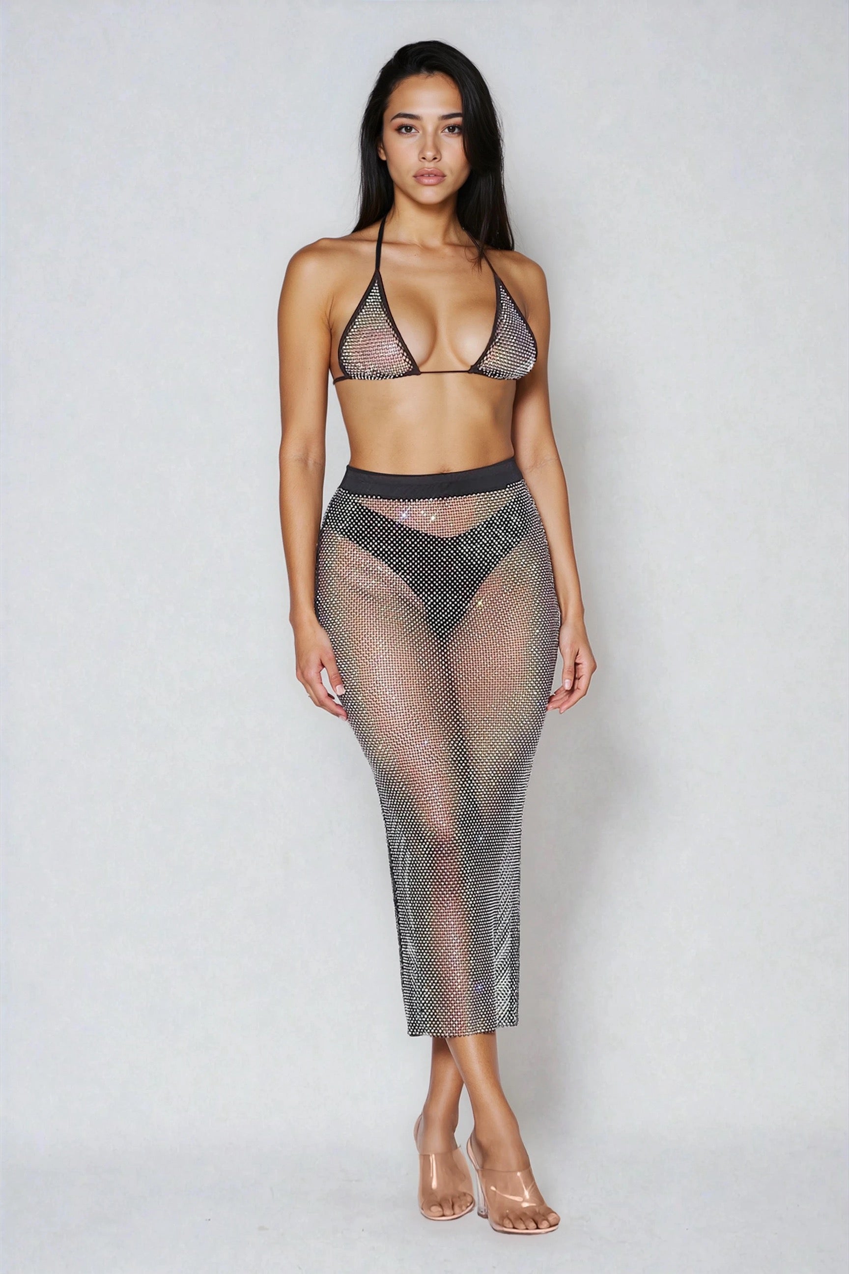The triangle bikini-style top ties at the neck and back, giving you an adjustable fit and sultry silhouette. Paired with the matching high-waisted midi skirt, this set combines sexy and sophisticated in one flawless look. The sheer mesh design highlights your curves while adding the perfect amount of sparkle, making it ideal for beach parties, vacations, or late-night glam.