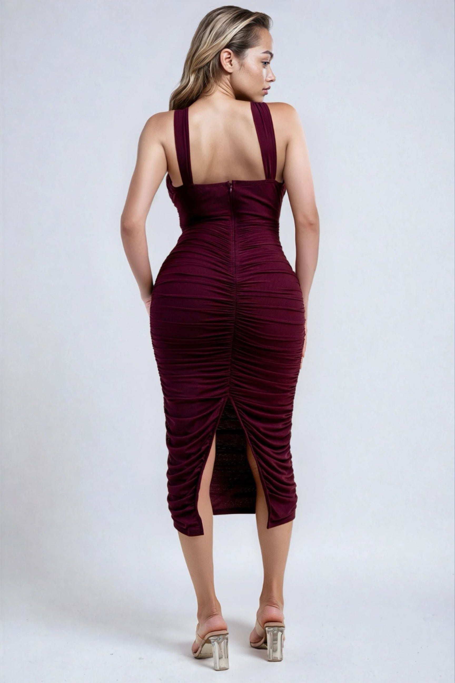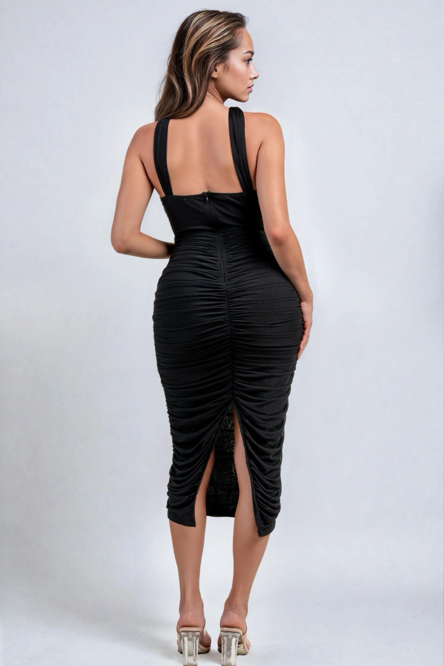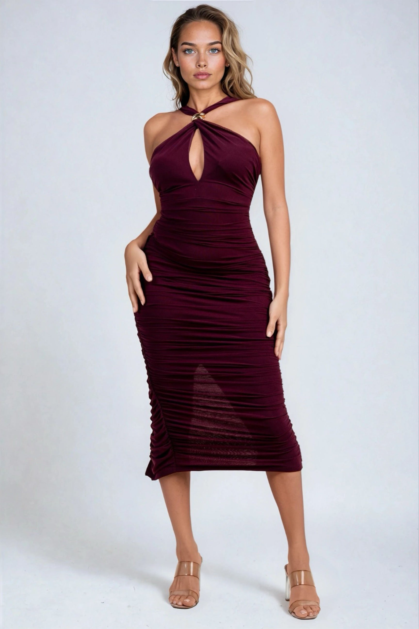Voel je zelfverzekerd met de Count Your Luck Halter Neck Ruched Bodycon Midi Dress . Deze prachtige jurk combineert een chique halterhals met een gedurfde sleutelgat-uitsparing aan de voorkant, wat de perfecte balans creëert tussen sexy en verfijnd. De gerimpelde details accentueren je figuur, terwijl de bodycon-pasvorm je rondingen accentueert. Afgewerkt met een zwoele split aan de achterkant en een ritssluiting, is deze jurk gemaakt om op elk evenement de aandacht te trekken - van cocktailparty's tot speciale avondjes uit.