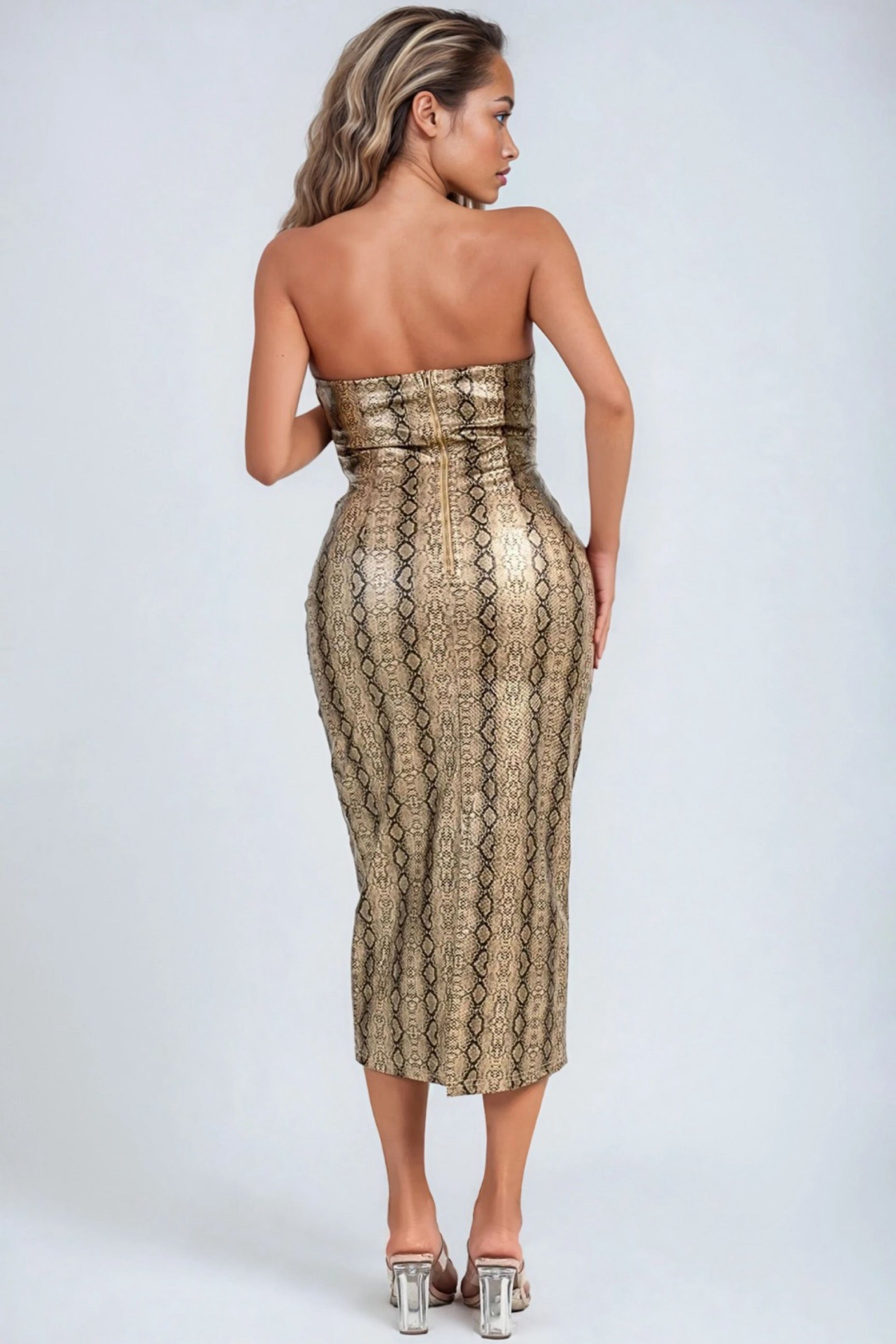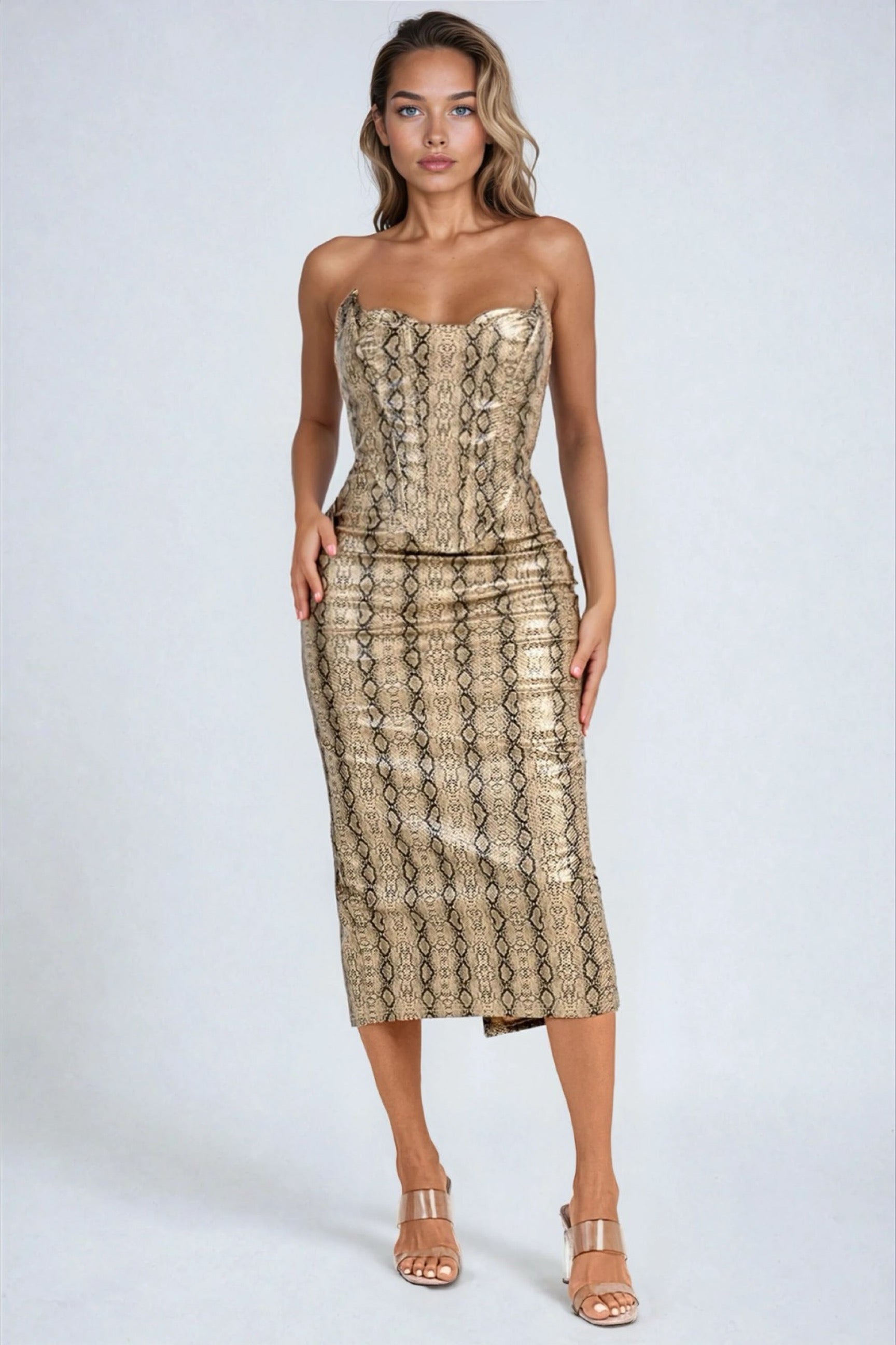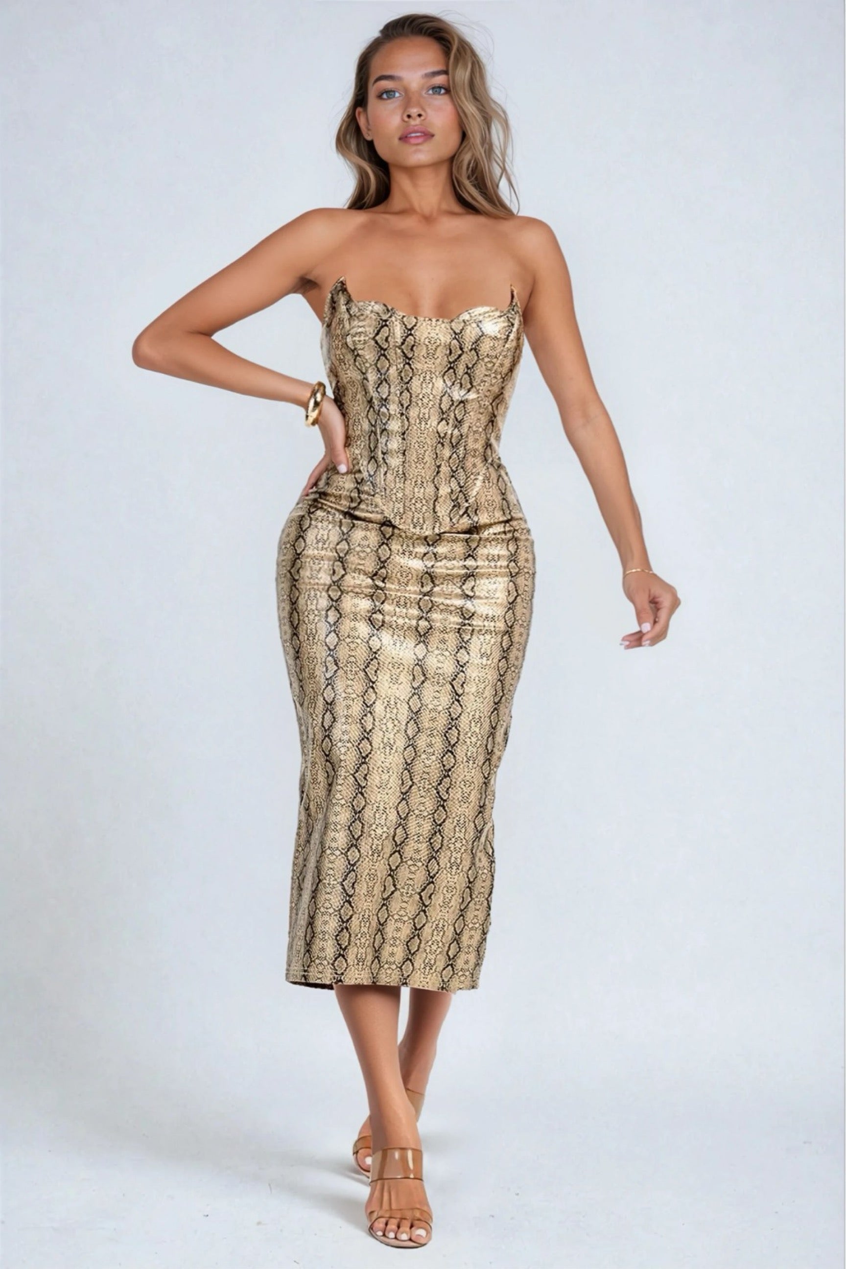 Trek de aandacht in deze gedurfde en verfijnde strapless Important fiquire strapless peekaboo corset snake skin print dress ontworpen om je rondingen te flatteren met een nauwsluitende pasvorm. Met een opvallende slangenprint in luxueuze goudtinten is deze jurk de perfecte statementjurk voor een avondje uit, een cocktailparty of een ander evenement waar je wilt schitteren.