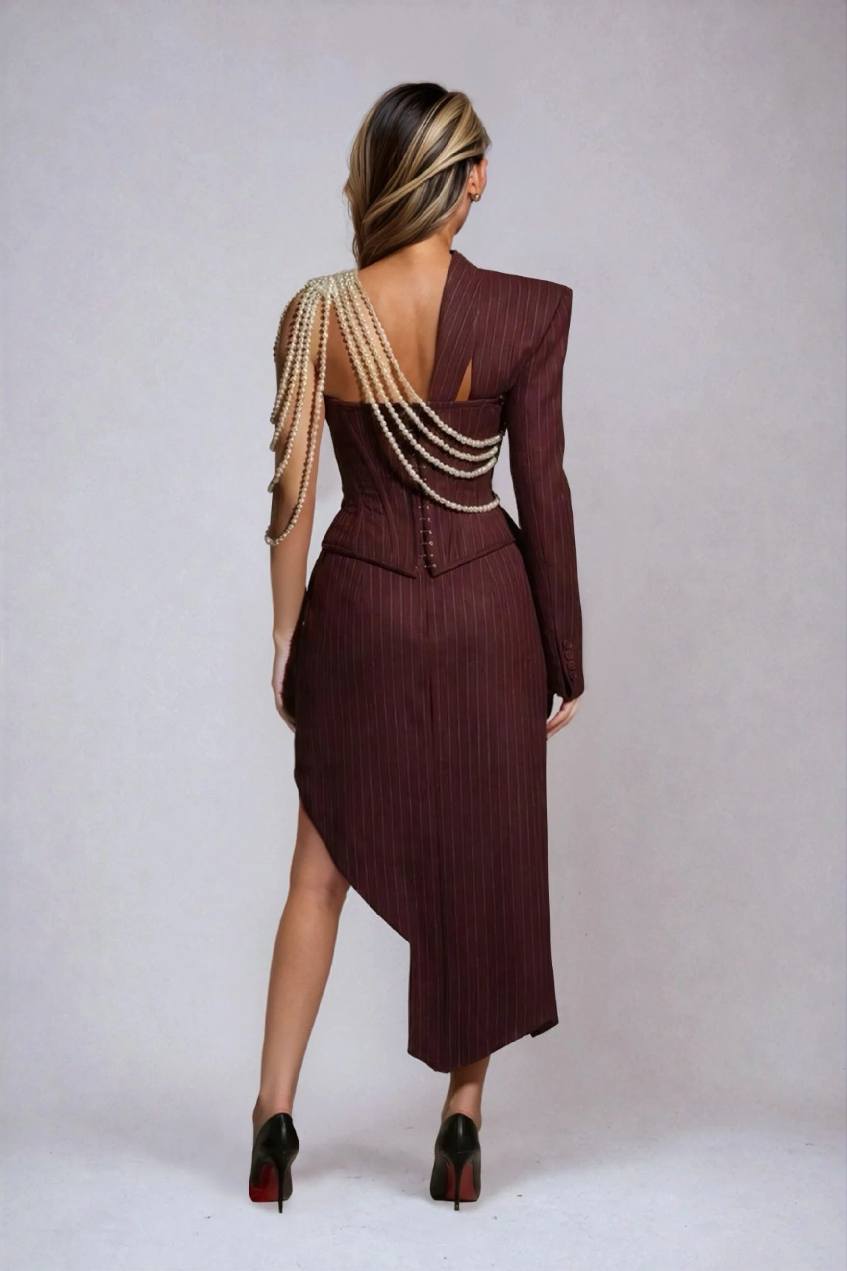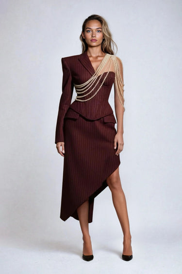 The structured pinstripe corset top features an asymmetrical blazer-inspired cut, accentuated by cascading pearl drapes that flow gracefully over the shoulder and back. Paired with a high-waisted asymmetric skirt, this set elongates the figure while delivering an unmistakably refined yet daring aesthetic.