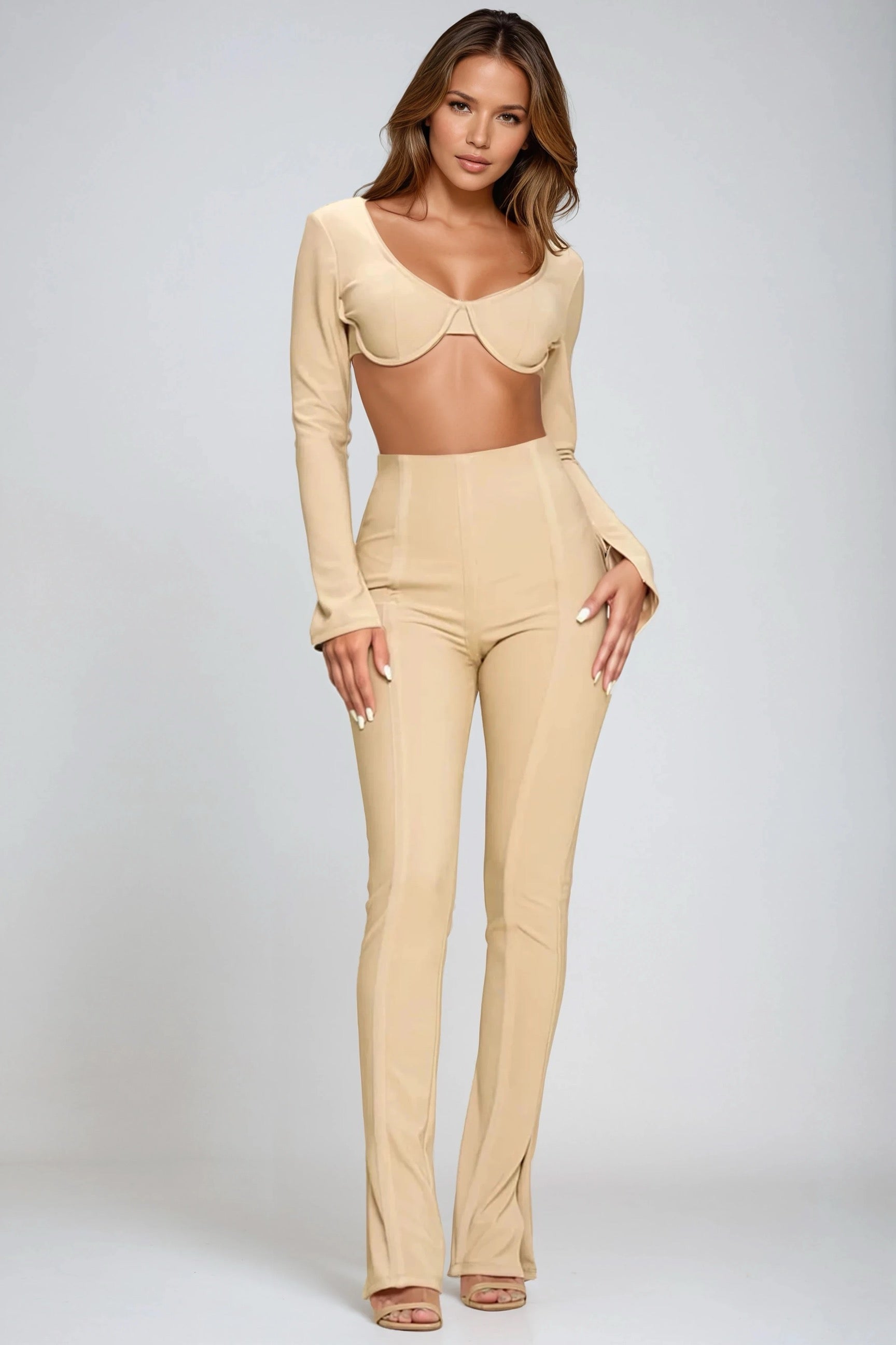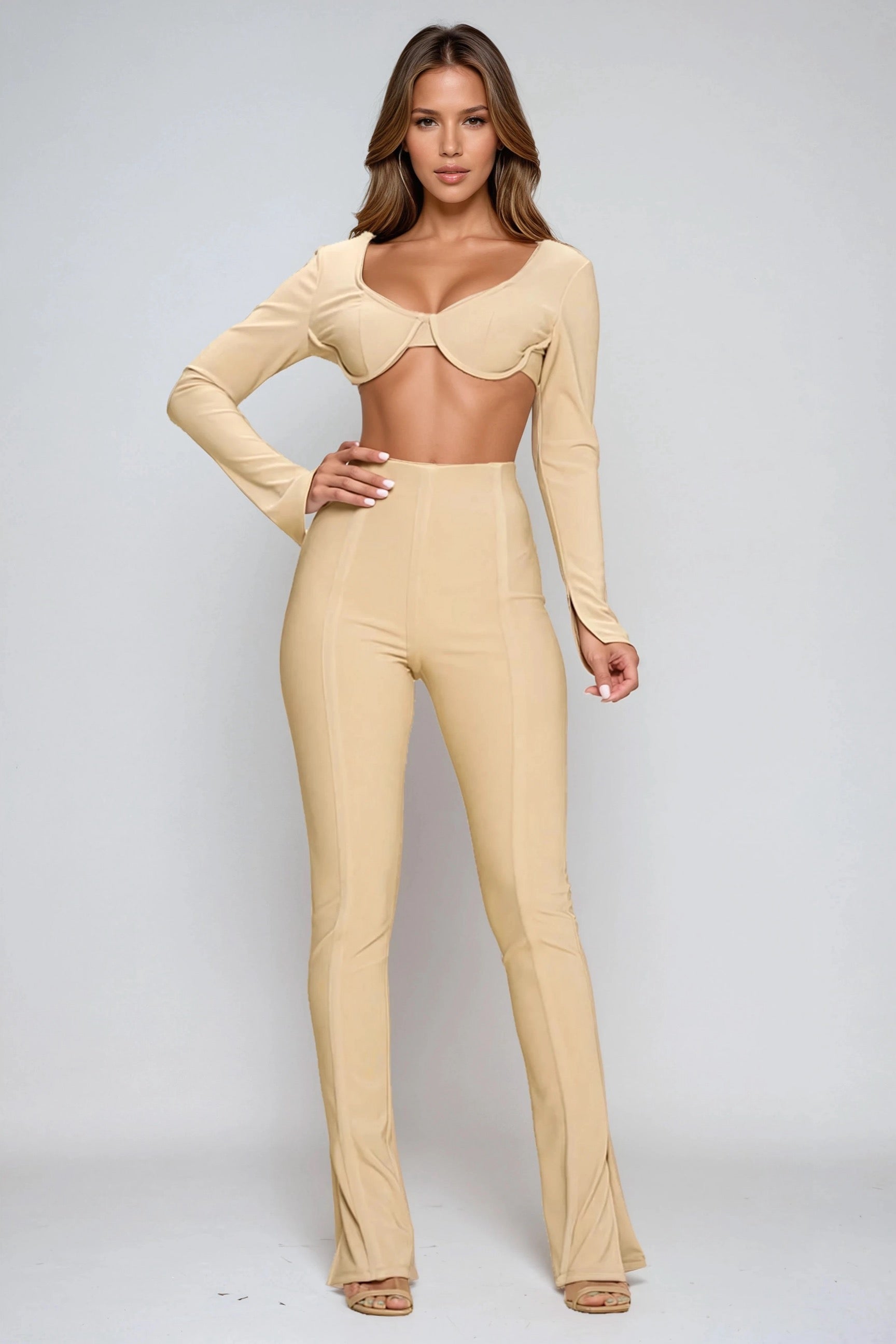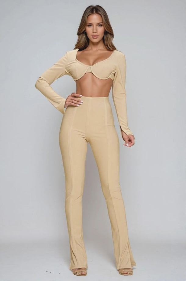 Turn heads with the Chasing Love Two-Piece Set, a bold yet elegant outfit designed to make a statement. Featuring a structured long-sleeve crop top with underwire detail and a sleek high-waisted pant, this set perfectly blends modern style with confident femininity. The body-hugging fit enhances your silhouette, while the minimal design makes it versatile for both upscale evenings and chic daytime outings.
