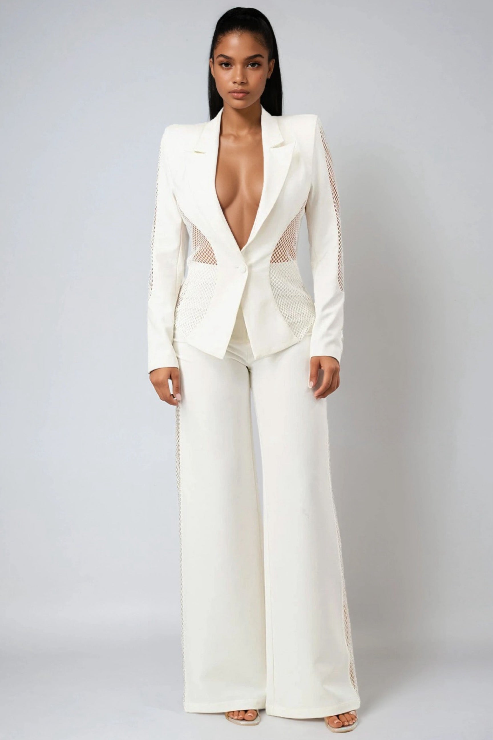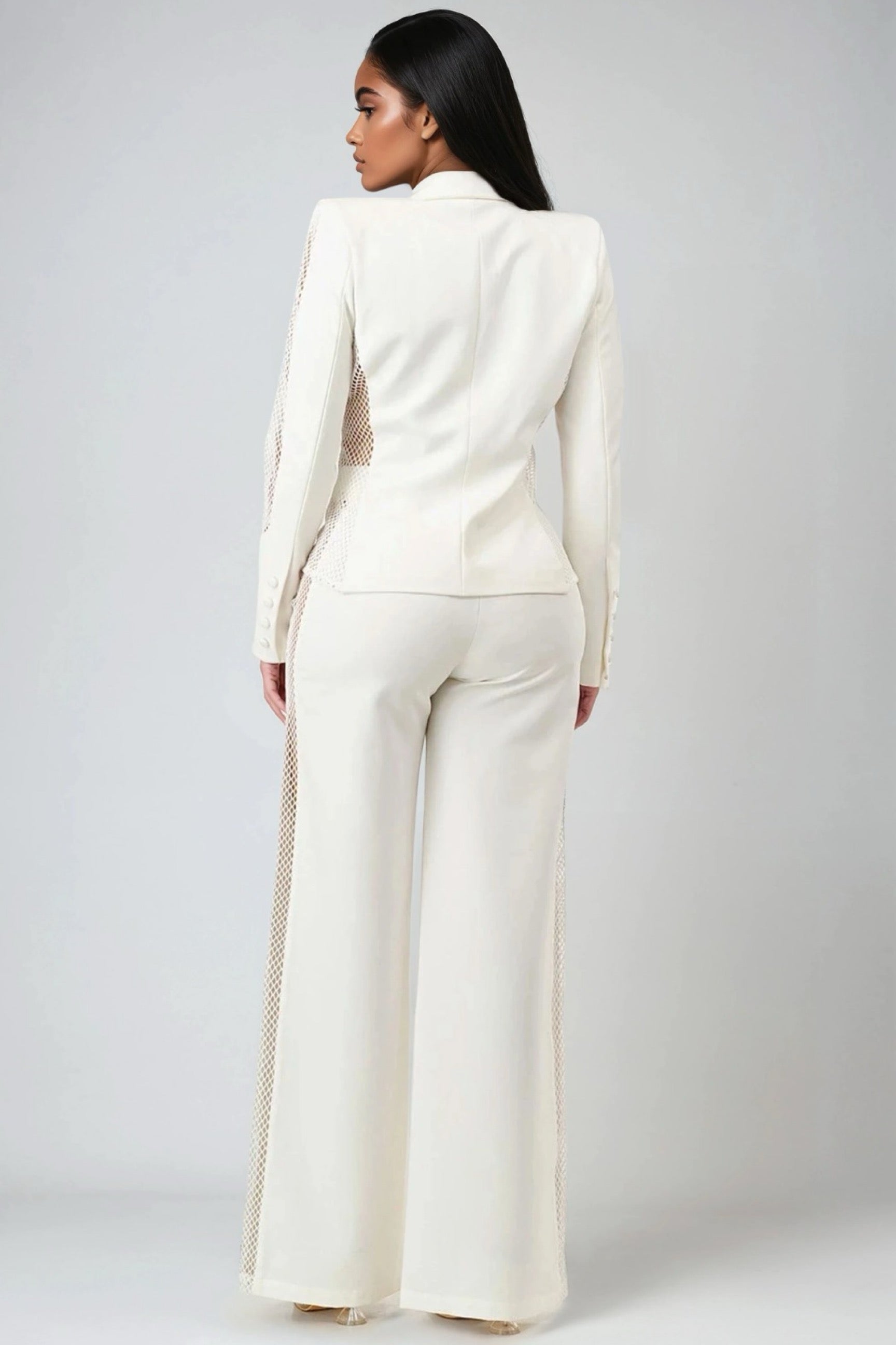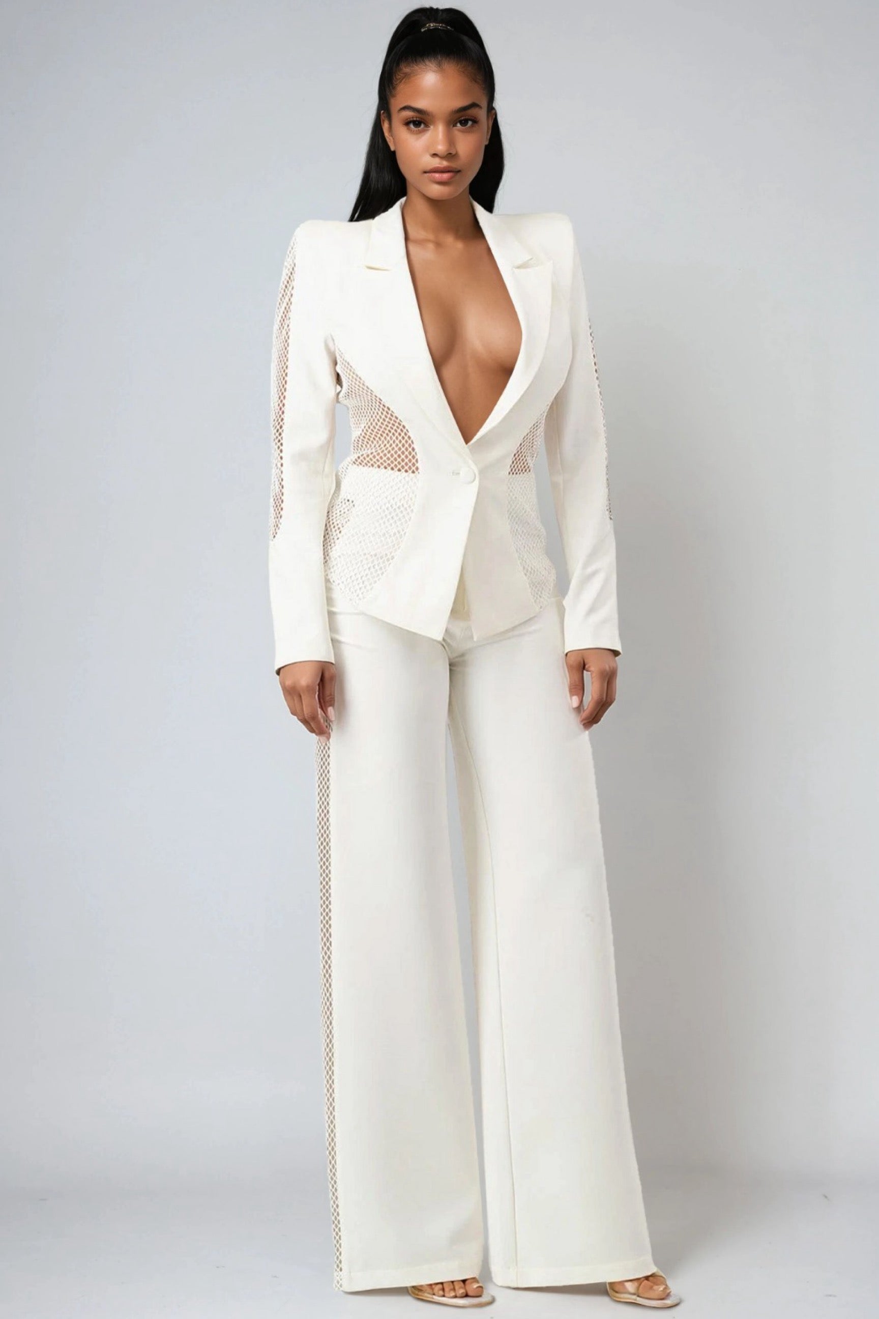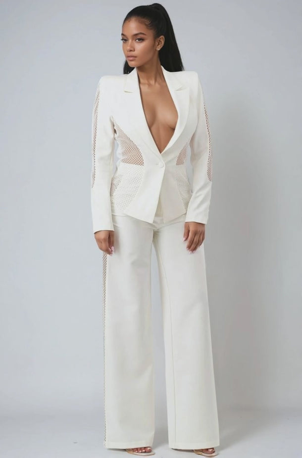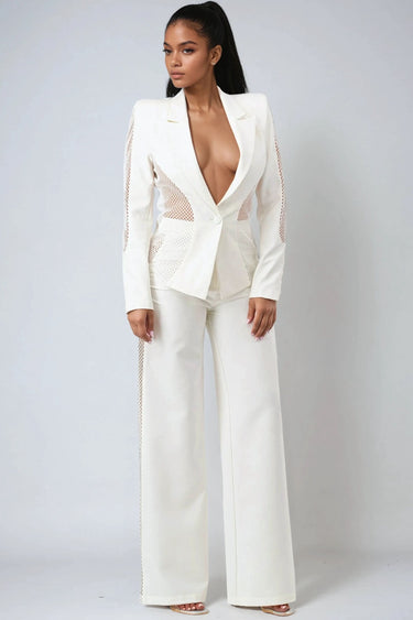 Turn heads in the No Time to Waste Blazer and Pants Two-Piece Set. Designed for the bold and confident woman, this modern power suit redefines sophistication with a daring twist. The sleek, structured blazer paired with the effortlessly flowing wide-leg pants creates a perfectly balanced silhouette that blends elegance and edge. Crafted in a timeless ivory hue, this set transitions seamlessly from high-fashion events to chic evening occasions.