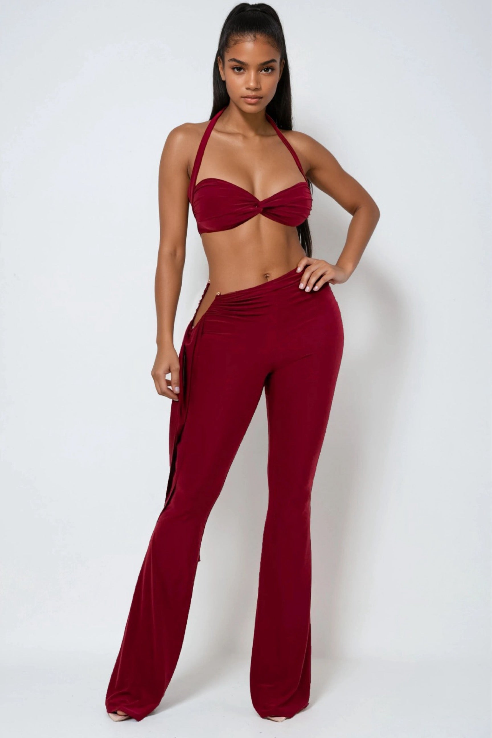Turn heads in the Tease Maker Top and Pants Two-Piece Set. A sultry, statement look designed to accentuate your curves. The set features a flattering halter-style crop top with a twisted front detail, paired with high-waisted flare pants that hug your figure in all the right places. Made from soft, stretchy fabric with a sleek finish, this outfit combines comfort with confidence. Perfect for a night out, parties, or making an entrance anywhere you go.